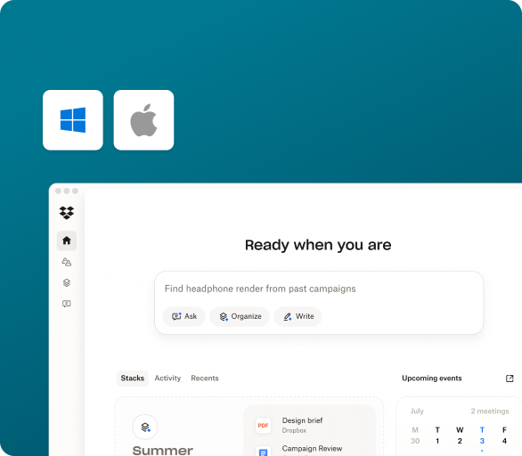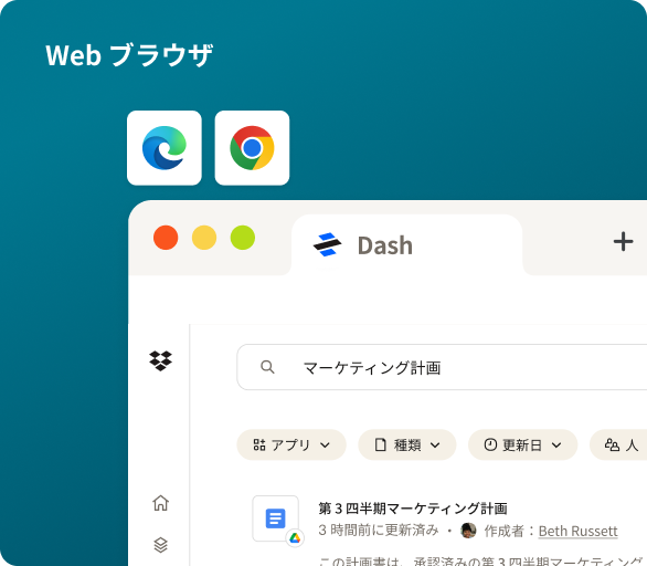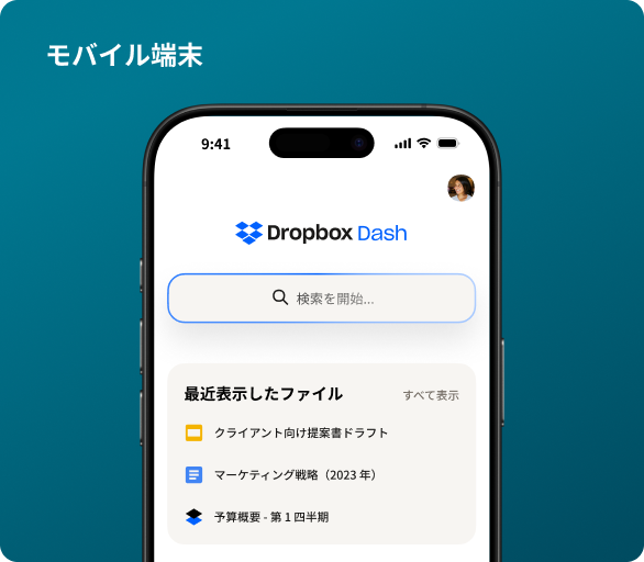 Dropbox Dash は、デスクトップやモバイル、Web ブラウザなど、あらゆる場所で利用可能。場所を問わずどこからでもスムーズに作業を進められます。