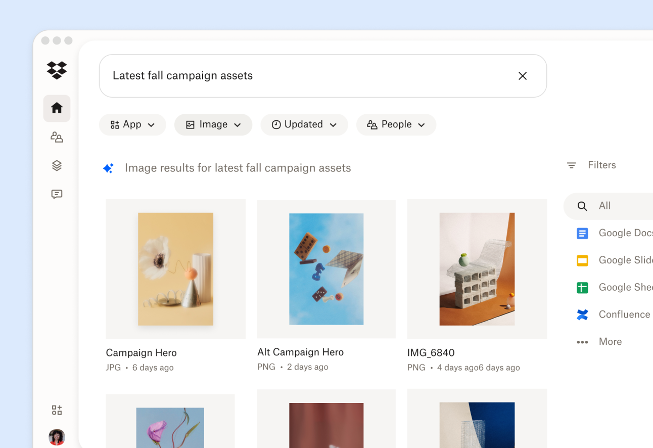 Get results from every connected app and every file type: text, images, videos, audio, and more